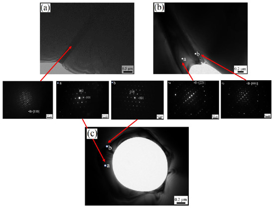 When the aging time was shorter than 1000 h, no TCP was found in the alloy. When the aging time was 5000 or 7500 h, three shapes were separated out in between dendritic crystals, including the needle shape, bar shape, and polygonal blocks (Figure 7). An evident interface was found between any shape of the precipitate phase and the matrix. Then, the micro-district diffraction spots of the precipitate phase were calibrated and analyzed. This phase had a complex triangular crystal structure, with lattice constants a = 0.4865 nm and c = 2.4732 nm. The EPMA results of the needle-shaped precipitate phase are listed in Table 4. Compared with the nominal composition of the DD6 alloy, the precipitate phase was rich in W, Re, and Mo and had a low content of Ni, and the contents of Nb, Cr, and Co were not greatly different from the nominal composition (Table 4). The richness in W, Re, and Mo and the deficiency in Ni are characteristic of the μ phase and M6C [27,28,29,30]. Together with the structural analysis of the precipitate phase in Figure 7, the precipitate phase was determined to be the μ phase. The difference in the content ratio of W to Mo (W/Mo) was the major cause for the different shapes in the precipitate phase. Based on Table 4, the W/Mo ratios of the precipitate phase in the different shapes (needle shape, bar shape, and polygonal blocks) were computed to be 2.11, 2.01, and 1.27, respectively (Table 4). These results indicate as the W/Mo ratio decreased, the morphology of the precipitate phase transited from the needle shape to the bar shape and polygonal blocks, indicating the precipitate phase tended to be polygons. The precipitation of the μ phase depleted the high-melting-point elements in the matrix, decreasing the solid solution strengthening effect, and the precipitation of the refractory elements intensified the diffusion of other alloy elements in between the γ/γ′ phases, weakening the γ′ phase and the γ/γ′ interface. The precipitate phase transited to polygons, so the TCP inhibited dislocation motion in the alloy, and restricted the resistance of γ′-phase-rafted structures against dislocation, thus accelerating the formation and expansion of crack TCP. This was one of the reasons why the stress rupture property of this alloy was significantly weakened after 5000 or 7500 h of aging.