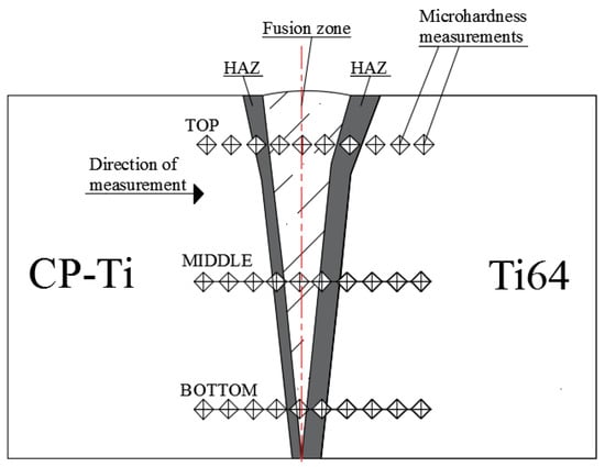 Figure 8 shows the results of the Vickers hardness measurements. The measurements were performed at the top, middle, and bottom of the weld joint following a trajectory corresponding to the width of the weld seam, starting from one of the substrates and transitioning to the other. Figure 8a presents the results of the experiments for the specimen welded at the highest input power of 2100 W. At the bottom of each specimen the average microhardness of the CP-Ti substrate was initially about 210 HV0.05, and slightly increased towards the top of the weld seam to 230 HV0.05. The heat affected zone (HAZ) formed closer to the CP-Ti substrate has an average Vickers hardness of 260 HV0.05 at the bottom of the weld, 320 HV0.05 in the middle, and 295 HV0.05 at the top of the weld. The fusion zone (FZ) has an average microhardness of 370 HV0.05 along the entire cross-section of the weld. The HAZ towards the Ti64 substrate has an initial microhardness of 462 HV0.05 at the bottom of the seam, which decreases to 375 HV0.05 at the middle and top of the weld. The Ti64 substrate has a microhardness of 370 HV0.05 in all cases. Regarding the specimen welded at a beam power of 1500 W (Figure 8b) the microhardness of the CP-Ti substrate was initially 210 HV0.05, and it increased towards the top of the weld to 230 HV0.05. The heat-affected zone closer toward the CP-Ti plate has an average Vickers hardness of 346 HV0.05 at the bottom, 280 HV0.05 in the middle, and 303 HV0.05 at the top. The fusion zone has a microhardness at the bottom and at the top of the weld of 370 HV0.05, and 398 HV0.05 in the middle of the weld. The HAZ towards the Ti64 plate has a value of 375 HV0.05 at the bottom, 390 HV0.05 in the middle, and 401 HV0.05 at the top. The Ti64 plate itself characterizes with a hardness of 360 HV0.05 in all cases. Following the line of the carried out measurements, the microhardness begins to increase from the first heat affected zone formed at the CP-Ti substrate, and increases through the fusion zone, the second heat affected zone, and to the Ti64 substrate. The increase of the microhardness towards the fusion zone can be explained with the increased presence of the formed α’-Ti martensitic phase in that area. Similar results were observed by previous researchers [35].
