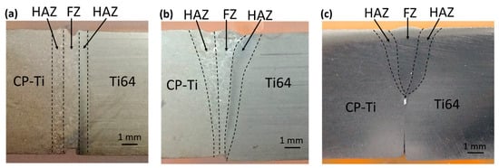 The CP-Ti (commercially pure titanium) and the Ti64 (Ti6Al4V) alloy are materials with slightly different thermo-physical properties due to the presence of alloying elements in the structure of Ti64. Despite having similar thermal and electrical properties, they have vastly different mechanical properties. Ti6Al4V has significantly higher yield strength, ultimate tensile strength, shear strength, and higher hardness. However, it characterizes as brittle with about 10–15% of elongation. Titanium, in comparison, has poorer mechanical properties, although it possesses higher plasticity and slightly better thermal conductivity. The welding of titanium and titanium alloy can be realized via gas tungsten arc welding (GTAW), gas metal arc welding (GMAW), plasma arc welding (PAW), laser beam welding (LBW), and electron beam welding (EBW) [16]. GTAW, GMAW, and PAW have the advantage of a large weld seam, which is advantages in the case of the welding of thick work pieces. However, during the welding process, while using these methods a large heat affected zone is observed, which can lead to a change in the structure and mechanical properties of the welded materials. The advantage of LBW and EBW in that regard is the narrow size of the heat sources, which means that a higher precision welding is possible. Furthermore, the welded materials are less thermally affected during the welding process due to the smaller imprint of the laser/electron beams. These methods are thus able to be used for the welding of thin specimens with complex geometries.