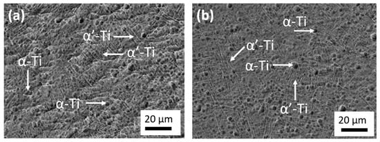 Figure 5 presents SEM images of the fusion zone of the two studied specimens—sample 1, welded with a beam power of 2100 W (Figure 5a), and sample 2, welded with a power of 1500 W (Figure 5b). The obtained images indicate that the first fusion zone formed during the welding of the specimens at a beam power of 2100 W consists primarily of pure α-Ti particles with some inclusions of the α’-Ti martensitic phase. A transformation of the α-Ti phase into the α’-Ti martensitic phase was observed, which led to a refinement of the structure of the weld seam. The results compliment the results obtained during the X-ray diffraction analysis.
