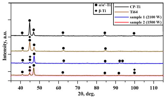 The phase composition of all weld seams is presented in Figure 6, along with the original phase composition of the substrate materials used as controls. In the case of the pure titanium substrate peaks, a clear α-Ti phase with a hexagonal closed-packed structure was observed. Such a diffractogram is standard for pure grade titanium substrates [30]. In the case of Ti64, a similar structure was observed, with the exception of the additional β-Ti phase which demonstrates a body-centered cubic structure. Vanadium in the structure of the Ti6Al4V alloy is used as a beta-stabilizing element, which forms the excellent balance of that alloy between the standard α-Ti phase and the secondary β-Ti phase, and which results in the improved properties of the alloy compared to CP-Ti. This completely correlates with the results obtained by the XRD experiments. During the welding process, a significant decrease of the β-Ti phase was observed in the volume of the weld seam, which is a result of the high thermal input applied in that area, followed by a subsequent rapid cooling of the weld seam. This leads to the formation of an α’-Ti martensite which has a hexagonal closed-packed crystal structure. This structure is formed via the transformation of the β-Ti bcc phase towards the α’-Ti martensitic one. This transformation was observed due to the addition to the material to a substantial amount of heat followed by very rapid cooling. During the electron-beam processing of the materials, the cooling rate can reach values of 104–105 K/s, which is the reason for the formation of the martensitic structure. The formation of martensitic phases in α + β titanium alloys depends on the chemical composition and cooling rate. The starting and finishing temperature of the formation of the martensitic structure depends on the amount of the beta stabilizing elements (V in this case), where a larger amount of vanadium leads to a decrease of these temperatures [31,32,33]. If the finishing temperature is below the room temperature, the beta phase is not completely transformed to the martensitic one. In the case of a lower starting temperature than the room temperature, the discussed transformation is suppressed and the beta phase remains untransformed [31,32,33]. Previous research indicates that subjecting Ti64 to electron-beam processing results in a transition from a double phase structure of α + β-Ti to the aforementioned α’-Ti martensite [34]. This is in agreement with the data obtained in the present work.