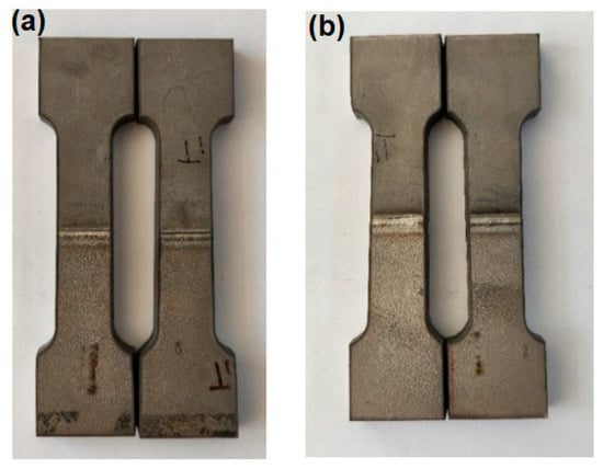 Tensile specimens used for analysing the mechanical properties of CP-Ti and Ti64 weld joints welded with a beam power of: (a) 2100 W, and (b) 1500 W.