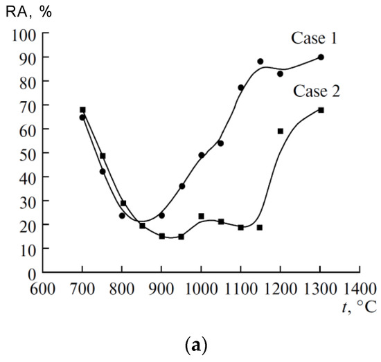 One of the most common methods for studying the ductility of steels at high temperatures is the measurement of the reduction in area (RA, %) of samples by tensile tests in the required temperature range, followed by the performance of the so-called hot ductility curves. The typical temperature dependence of ductility (RA) has a trough that starts at about 700 °C and can increase to the solidus temperature. Figure 2 shows the temperature dependences of RA with a plasticity trough and the corresponding microphotography of fractures.