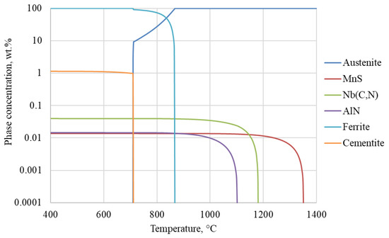 Equilibrium phase composition of steels containing, wt.%: 0.8 Mn, 0.3 Si, 0.045 Al, and 0.007 N. Reprinted with permission from ref. [78]. Copyright 2023 Metallurgizdat.