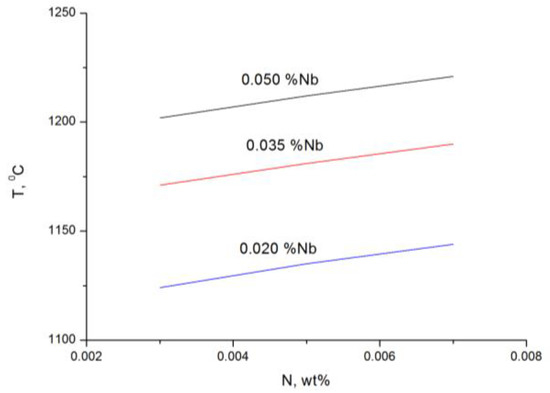 Indeed, as studies show, at higher temperatures, a more nitrogen-saturated carbonitride is formed [5]. Figure 4 shows the results of the thermodynamic calculation of the temperature of formation of niobium carbonitride precipitates at various Nb and N contents conducted using a computer program [48] for steel of basic composition, wt.%: 0.08 C–0.60 Mn–0.10 Si–0.045 Al–0.005 S–0.005 P. It can be seen that, with an increase in the nitrogen content at each given concentration of niobium, the temperature of the beginning of Nb(CN) precipitation increases.