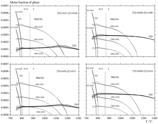 The main factor that improves hot ductility is the precipitation of titanium nitride at a high temperature. These particles, on the one hand, are larger; on the other hand, they serve as a substrate for the subsequent precipitation of niobium carbonitride. As a result, the size of the precipitates present in the microstructure is larger and their quantity is reduced. This can be clearly explained from a thermodynamic analysis of the regions of phase existence in the steels under consideration. Figure 5 shows the results of a thermodynamic calculation of the equilibrium phase composition of steels containing, wt.%: 0.8 Mn, 0.3 Si, 0.045 Al, and 0.007 N with varying concentrations of C (0.08 and 0.11), Nb (0.02, 0.04, and 0.07), Ti (0.010 and 0.025), and V (0.05 and 0.07). It can be seen that Nb(C,N) precipitation during cooling begins much later than TiN. In addition, according to the results of [77], the formation of carbide, carbonitride precipitates of niobium, even during deformation, is kinetically inhibited. Therefore, in the absence of titanium, the formation of more dispersed niobium precipitates occur.