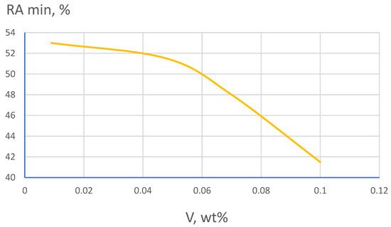 Two steels with various vanadium contents, wt.%: 0.151 C–0.374 Si–1.520 Mn–0.047 Nb–0.020 Ti–0.029 V and 0.156 C–0.370 Si–1.601 Mn–0.047 Nb–0.020 Ti–0.041 V, were studied in [41]. Steel with a high vanadium content (0.041 wt.%) has a deeper trough: the smallest redaction of area is 66.5% at a fracture temperature of 700 °C, while steel with 0.029% V has 75.5%. Figure 8 shows the decrease in the minimum value of RA for steel of the base composition, wt.%: 0.11–0.13 C, 0.3–0.34 Si, 1.39–1.43 Mn, 0.016–0.02 P, 0.003–0.004 S, 0.005–0.0053 N, with increasing concentration V from 0.009 to 0.1 wt.% [42]. The best ductility was in steel with 0.009 wt.% V: the minimum redaction of area was about 53% at 800 °C.