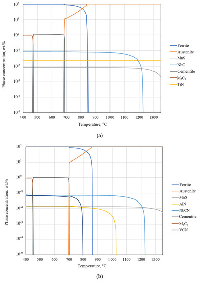 Equilibrium phase composition of steels, wt.%: (a) 0.08 C–0.027 Si–0.34 Mn–0.022 Al–0.011 Nb–0.0032 N; (b) 0.08 C–0.024 Si–0.71 Mn–0.032 Al–0.032 Nb–0.0048 N. Reprinted with permission from ref. [81]. Copyright 2023 Metallurgizdat.