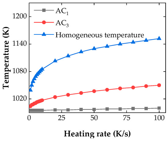 The previous studies indicate that the phase transformation and the inhomogeneous distribution of the second phases play an important role in abnormal grain growth [31,32,33]. Therefore, the material parameters related to the phase transition and the distribution of the second phase, including the temperature, temperature, the homogeneous temperature and the heating rate should be taken seriously. Based on the Time-Temperature-Austenitization (TTA)diagram, the temperature, temperature and homogeneous temperature of 25Cr2Ni4MoV steel are calculated at different heating rates as shown in Figure 1. is the temperature at which austenite formation begins, and is the temperature at which austenite formation ends. Because the driving force of the grain growth from to temperature is the interface movement caused by phase transformation instead of grain boundary movements, the grain growth in this temperature range is ignored. The homogeneous temperature can be defined as the temperature at which the phase transformation and the homogenization of carbon and alloying elements have been fully completed. According to the actual heating process, the heating rate of the super-large nuclear-power rotors is generally lower than 100 K/s. Figure 1 indicates that 25Cr2Ni4MoV steel will not undergo abnormal grain growth caused by the secondary particle pinning or the element segregation at the grain boundary when the final heating temperature is not lower than 1173 K.