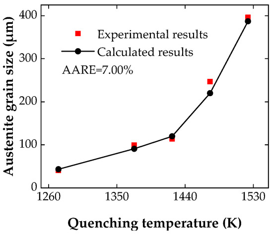 To verify the accuracy of the grain growth model, the above numerical model is used to predict the grain size during continuous heating. The parameters of the calculation model are consistent with the experimental parameters. The parameters are stated as follows: the heating rate is 20 K/min, and the final heating temperatures are 1173, 1273, 1373, 1423, 1473, and 1523 K. is the grain size of the sample heated to the temperature, which is approximately 22.4 μm. The specimens were water quenched immediately after reaching the specified heating temperature. Finally, the specimen were cut along the axial direction and the cut surface were mounted, polished, and etched with a saturated aqueous picric acid solution to observe the austenite morphology using a metallographic microscope Axio Scope A1. The average grain sizes at the sliced section were measured according to ASTM standards. Figure 3 indicates that the predicted results show good agreement with the experimental results, and the average absolute relative error (AARE) is 7.00%.