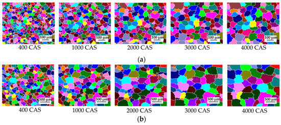 Figure 5 shows the microstructure of the grain growth at different temperatures and Figure 5 shows the microstructure of the grain growth at different temperatures and simulation time calculated by the CA model. The white closed boundary represents the grain boundary, and the interior of the grain is filled with color. Due to the unique orientation of each grain, the grain growth caused by the grain coalescence is avoided, which is inconsistent with the actual situation. Then the grain coarsening is dominated by diffusion at grain boundaries and consumption of smaller grains adjacent to larger grains. The previous studies indicate that if the simulation model of grain growth only considers the lowest energy principle, the calculated grain boundaries are smooth and straight [40]. As the CA model developed in this paper considers the effects of the thermodynamic driving mechanism, the lowest energy principle and curvature-driven mechanism on the grain growth, the homogeneously distributed grains have the polygonal shape with zigzag rather than smooth grain boundaries, which is consistent with the grain growth mechanism. Figure 5 suggests that the grain size increases as the CAS increases at a certain temperature, and the larger temperature leads to a larger average grain size at a certain CAS.
