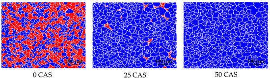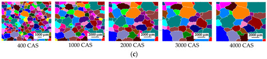 Grain size distribution is widely used to study the uniformity of microstructure. Figure 15 shows the grain size distribution at 1523 K with different simulation times. The grain size distribution obeys logarithmic normal distribution at 400 CAS. With the extension of the simulation time, the grain size distribution is not very stable. This instability is mainly due to changes in the number of larger and smaller grains. For example, grains with appear at 400 CAS, 1000 CAS and 3000 CAS, while grains with this size disappear at 2000 CAS and 4000 CAS. Then a small number of grains with appear at 400 CAS and 1000 CAS, which disappear with the increase of the simulation time. The results of all different simulation steps indicate that the maximum frequency is at , which means that most grain sizes are close to the average grain size. When approaches 0 or 2, the distribution frequency approaches 0, indicating that there are few grains of larger and smaller sizes than the average grain size and the grain size distribution is relatively uniform. Figure 15 shows that the cutoff positions for 400 CAS and 1000 CAS are 2.1, and the cutoff value for other simulation steps is 1.9. It is close to the cutoff value of 2–2.5 reported in most studies [57,58,59].