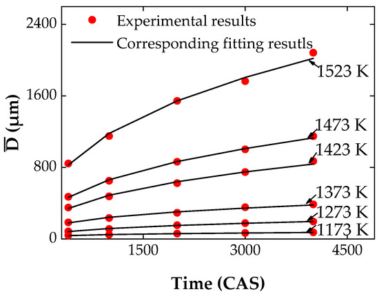where is the average grain diameter, is the simulation time, is the constant and is the growth exponent. The research on the growth exponent has always been controversial. Different simulation methods [41,42,43] and experiments [44,45,46] can obtain different grain growth exponents. Many studies have pointed out that the growth exponent range is [47,48,49]. When the influence of impurities and second phase particles on normal grain growth can be ignored, the grain growth exponent is usually 0.5. Figure 7 shows the relationship between the average grain diameter and the simulation time at different temperatures. Figure 8 shows the linear relationship between and . The fitting results are basically consistent with the experimental results as shown in Figure 9. It is determined that the grain growth exponent simulated by the CA model is approximately 0.35 by taking the average slope value. It can be explained that more lattice points are occupied within the grain as the simulation time increases. Due to the strong randomness of the CA method, randomly selected lattice points are more likely to fall within the grain rather than at the grain boundary. Therefore, with the extension of the simulation time the possibility of achieving the grain growth through the grain boundary migration decreases, and the grain growth slows down, resulting in a growth exponent of less than 0.5.