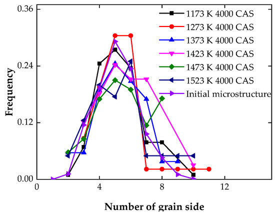 Figure 12 shows that there are only a few grains with the grain size smaller than 4 or larger than 9. The 5-sided grains have the highest probability of occurrence nearly among all the topological classes, followed by 6-sided grains, and finally the 4-sided grains. The number of sides with the highest frequency has always been controversial. Some experimental and simulation models show that the value is 5 [51,52], while others indicate that the value is 6 or greater [22,41,53]. Studies have shown that the initial microstructure significantly affects the topology during grain growth [54,55]. Figure 12 shows the highest frequency in the initial microstructure is 5-sided grains, followed by 6-sided grains. This may promote the occurrence of the phenomenon that the frequency of the 5-sided grains rather than the 6-sided grains is the highest during the subsequent grain growth process.