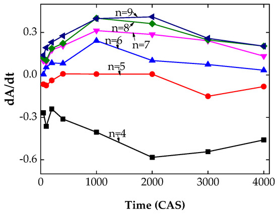 Figure 10 shows the relationship between the average growth rates and the grain radii by analyzing the results of 2928 grains at different temperatures with different CAS. It is shown that the grains with radii larger than will grow and those with radii less than will shrink, which conforms to the Hillert equation well. However, each individual grain may not follow Hillert’s equation. It is clear that the plot shows a large fluctuation in the data, especially for grains close to the average grain size. Therefore, it is impossible to obtain a linear relationship between the average grain growth rate and the grain radii, which is different from previous research results [22].