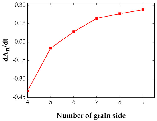 As there are only few grains that have less than 4 sides or more than 9 sides, only the growth kinetics of grains with 4–9 sides were studied. As shown in Figure 13 the area change rate of all grains with a side number of not less than 6 is greater than 0, and the average area change rate of all 4-sided grains is less than 0. Therefore, grains with a side number not less than 6 are growing, while 4-sided grains are shrinking. The situation for 5-sided grains is complicated. Those grains can either grow or shrink as well as have zero growth rate depending on their sizes and their neighbor grains or local topology arrangements. As shown in Figure 14, by taking the average value of the results of all temperatures and step sizes, it is found that the average area change rate is less than 0 for grains with less than 6 sides, while the average area change rate is greater than 0 for grains with no less than 6 sides. However, the area change rate of the 5-sided grain rather than the 6-sided grain is closer to zero, which is inconsistent with the Mullins equation [56]. One of the reasons for this disagreement may be the fact that this equation comes purely from the mathematical requirement of space-filling, and surface tension constraints are not considered. Regardless of the number of sides, the total growth rate is larger than zero for all grains in the system.