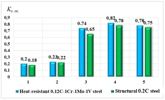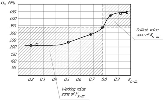In addition, the values of tangential shear stresses (σd, MPa) were established at certain values of the structural–mechanical criterion (Ks.-m.) for samples of power equipment made of heat-resistant 0.12C-1Cr-1Mo-1V steel (Figure 3).
