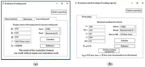Automated evaluation and forecasting system health: (a) an example of calculating the complex criterion of the limiting state of a long-term metal that can operate without repair and restoration work; tab = “Evaluation of working metal”; (b) calculation of the remaining operating time; tab = “Evaluation and forecasting of working capacity”.