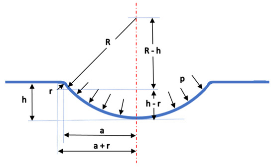 Figure 1 shows the scheme of the process used to cold form a thin circular sheet using pressurized gas. The sheet is positioned on a circular die characterized by a radius a and a fillet radius r. In Figure 1, R is the current value of the metal sheet bend radius and h represents the maximum depth reached and measurable at the apex of the formed dome.