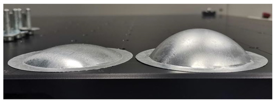 The equipment consists of a die divided into two parts. The lower part of the die is characterized by a cavity in which, through the opening of a special solenoid valve, pressurized air enters pushed by a compressor. The upper die, by tightening with four hex head screws, acts as a blank holder, keeping the edges of the sheet constrained to the lower die during the forming process. The screws were fixed using torque wrench with a torque of about 40 Nm. In order to avoid possible misalignment between the die and the blank holder, it has been used a metal gasket between die and specimen. The gasket was made with the same formed material (EA AW 8006 H0), but with a different thickness (200 μm instead 105 μm). In fact, preliminary tests showed that forming the specimens without the metallic gasket could allow the displacement of the specimens between blank holder and die, invalidating the test. The air pressure coming from the compressor is regulated by using a proportional valve connected to a voltage generator. Cold free forming tests were performed at forming pressures of 0.30, 0.35, 0.40, 0.45, and 0.50 MPa. Higher pressure values showed the failure of the specimens, while lower pressures were not investigated because they showed low plastic deformations. Forming tests were realized using a pressure ramp of about 0.1 MPa for minute. In fact, preliminary tests allowed the failure of the specimens if the variation of pressure during forming from room pressure to the target pressure was fast. Once the target values have been reached, the specimens were maintained at that pressure for about 5 min. In another work of the authors [33], the effect of the holding time on the height of the formed domes were investigated. It has been observed that holding time influenced the height of domes but in a negligible way. An example of formed domes is reported in Figure 3.