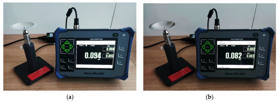The measurement of the thickness at the apex of the dome was carried out through the Hall effect thickness gauge Magna-Mike 8600 produced by Olympus Scientific Solutions Americas (MA, USA). The sheet to measure is placed between the magnetic probe and a target consisting of a steel sphere with a diameter of 3.175 mm. Specifically, the probe was fixed on a specific tool while the target was positioned into the cavity of the dome. Subsequently, the dome was manually bright into proximity to the probe: the magnetic field of the probe positioned the target in an optimal way, so as to make the measurement accurately. The instrument allows measuring thicknesses between 1 μm and 6.1 mm with a resolution lower than 5 μm. In Figure 5a,b, it is possible to observe respectively the measurements for a dome thickness formed with a pressure of 0.35 MPa and for a dome thickness formed with a pressure of 0.50 MPa.
