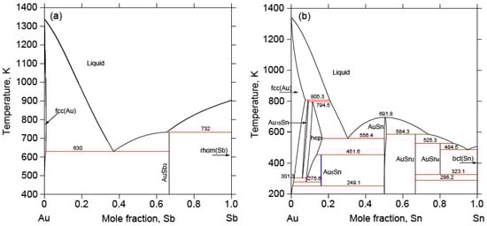 Calculated (a) Au-Sb and (b) Au-Sn binary phase diagrams by Wang et al. [] with permission from Elsevier, 2011, and Dong et al. [] with permission from Elsevier, 2013.