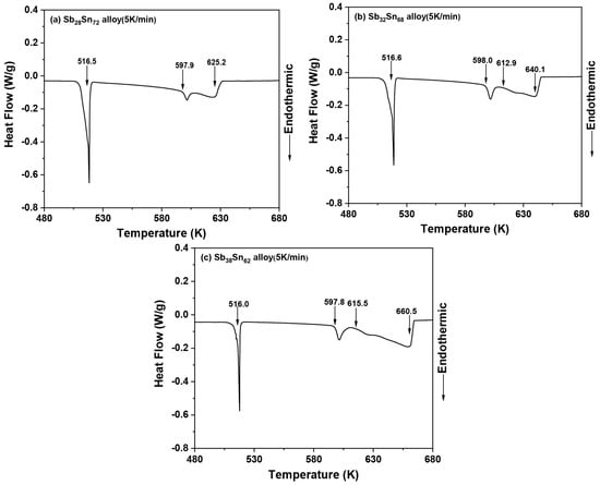 Figure 2 shows the thermal analysis curves of SbxSn1−x (x = 0.28, 0.32, 0.38) alloys at the heating rate of 5 K/min. A slow onset followed by an invariant effect appeared around 510.6–514.4 K with a clear kink before the peak at 516 K. The experimental results were in agreement with the reported data [,,]. The temperatures of two peritectic reactions, L + Sb3Sn4 ↔ bct (Sn) at 516 K and L + SbSn ↔ Sb3Sn4 at 598 K, were determined. Finally, the phase transitions of the liquid phase were at 625.2 K, 640.1 K, and 660.5 K, respectively.
