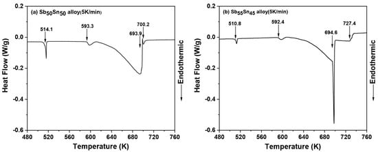 Figure 3 shows the thermal analysis curves of SbxSn1−x (x = 0.50, 0.55) alloys. As shown in Figure 3a, two weak thermal effects at 514.1 K and 593.3 K were found. The transition from the SbSn single-phase region to the two-phase region with SbSn and liquid phase is visible in the temperature range of 620–693.9 K. The peritectic reaction (L + rhom(Sb) ↔ SbSn at 693.9 K) and the liquidus temperature at 700.2 K were determined. Figure 3b shows endothermic peaks at 510.8 K and 592.4 K, and incomplete peritectic reactions were found in the Sb-Sn binary system, which leads to some spurious effects in the DSC measurements. Four peaks were recorded in the heating curves of these two Sb-Sn alloys, while only two peaks, corresponding to the liquidus and invariant reaction, would be expected. The small thermal effect is related to an excess of the liquid phase due to the incomplete peritectic reaction. The transition from the SbSn single-phase region to the L + SbSn two-phase region was in the temperature range of 620–694 K. The temperature of the peritectic reaction (L + rhom(Sb) ↔ SbSn) and the liquidus temperature were measured as 694.5 K and 727.4 K, respectively.