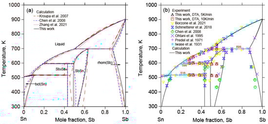 (a) Calculated Sb-Sn binary phase diagram with the calculated results data from [,,] and (b) the experimental data determined in this work and the reported results data from [,,,,,].