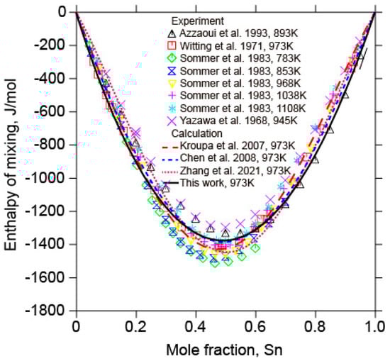 Calculated enthalpy of mixing of liquid Sb-Sn alloys in relation to the experimental data from [,,,] and the calculated results data from [,,] at 973 K. (Reference states: liquid Sn and liquid Sb).