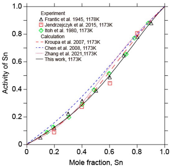 Calculated activity of Sn in liquid Sb-Sn alloys in relation to the experimental data from [,,] and the calculated results data from [,,] at 1173 K. (Reference state: liquid Sn).