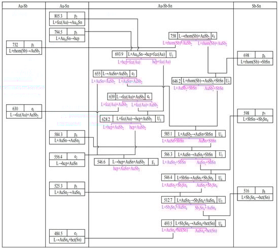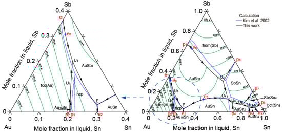 Figure 7 shows the calculated liquidus projection of the Au-Sb-Sn ternary system in this work. The calculated reaction scheme related to the liquid phase is shown in Figure 8. The comparison of the calculated invariant reactions in this work with the literature [] and the calculated results of Kim et al. [] is shown in Table 4. There are eight U-type reactions and one E-type reaction. There were some differences between the calculated invariant reactions in this work and Kim et al. [] due to the liquidus projection of Kim et al. [] not being consistent with the liquidus boundary of the Sb-Sn binary system. The calculated compositions and temperature of the eutectic reaction (L → hcp + AuSn + AuSb2) are in good agreement with the literature [].
