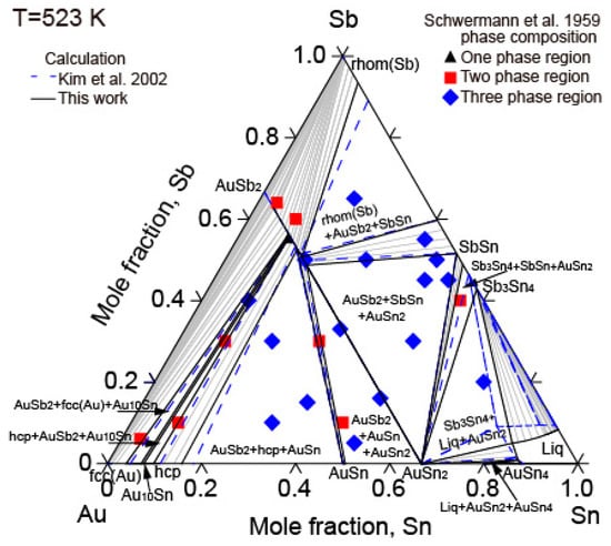 Figure 9 is the calculated isothermal section of the Au-Sb-Sn ternary system at 523 K of this work with the experimental results of Schubert et al. [] and the calculated results of Kim et al. []. Although both Au-Sn and Sb-Sn binary phase diagrams show the liquid phase to be stable at 523 K on the Sn-rich side, the liquid phase and Sb3Sn4 were not observed by Schubert et al. []. Thus, the experimental results of the isothermal section at 523 K measured by Schubert et al. [] were used as a guide for the Au-rich part. The calculated isothermal section at 523 K was in good agreement with the experimental data measured by Schubert et al. [].