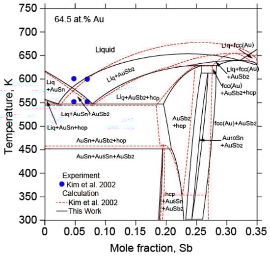 The calculated vertical section of 64.5 at.% Au in the Au-Sb-Sn ternary system in relation to the experimental data from [] and the calculated results data from [].