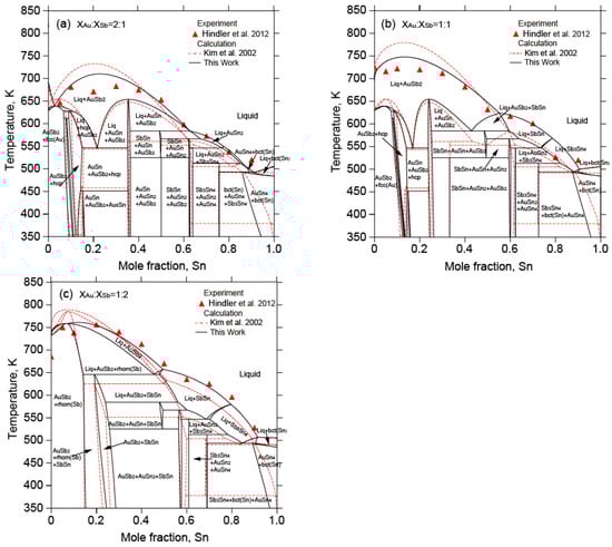 Figure 10 shows the calculated vertical section of 64.5 at.% Au with the experimental data [] and the calculated results []. The calculated results in this work were quite close to the assessment by Kim et al. [] and agree reasonably well with the experimental data []. The calculated vertical sections with different molar ratios ( = 2:1,  = 1:1,  = 1:2) with the experimental data [] and the calculated results [] are depicted in Figure 11. The calculated three vertical sections in this work were consistent with the experimental data [].