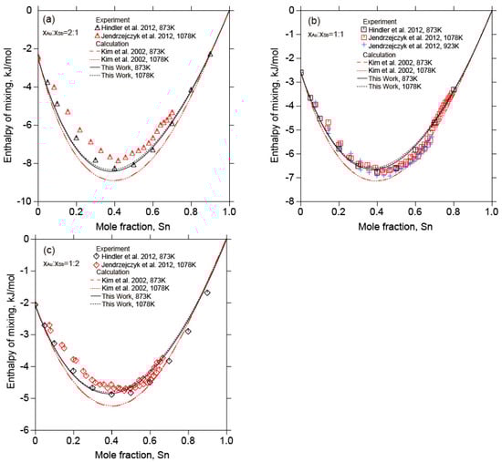 Figure 12 is the calculated enthalpy of mixing of the liquid Au-Sb-Sn alloys at 873 K  and 1078 K along different sections ( = 2:1,  = 1:1,  = 1:2) with the experimental data [,] and the calculated results []. It can be seen that the current calculated results were in good agreement with the experimental data [,], while the calculated results of Kim et al. [] were much more negative. Finally, the calculated enthalpies of mixing of liquid Au-Sb-Sn alloys ( = 2:1,  = 1:1,  = 1:2) with the experimental data [] and the calculated results [] at 873 K are depicted in Figure 13. The calculated results of this work are better in relation to the experimental data []. Figure 14 illustrates the calculated enthalpies of mixing of liquid Au-Sb-Sn alloys along different sections ( = 2:1,  = 1:1,  = 1:2) in relation to the experimental data [] and the calculated results []. The calculated results in this work are reasonably consistent with the experimental data [] and were better than the calculated results [].