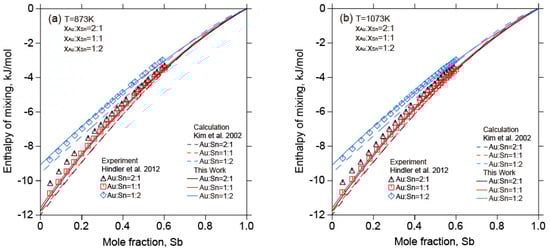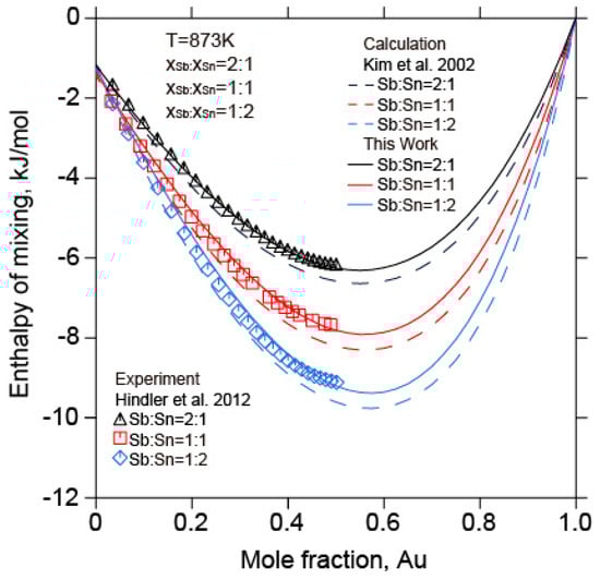 Thermodynamic properties of the Au-Sb-Sn ternary system were investigated experimentally [,,]. Hindler et al. [] measured the enthalpy of mixing of liquid Au-Sb-Sn alloys with different composition ratios (, ,  = 2:1, 1:1, 1:2) at 873 K and 1073 K using electromotive force (EMF) method. Meanwhile, the activity of Sn in liquid Au-Sb-Sn alloys with different composition ratios ( = 2:1,  = 1:1,  = 1:2) at 873 K by the EMF method was determined. Jendrzejczyk et al. [] measured the enthalpy of mixing of liquid Au-Sb-Sn alloys with different composition ratios ( = 2:1,  = 1:1,  = 1:2) at 923 K and 1078 K using a high-temperature calorimeter. Recently, the activity of Sn ( = 2:1,  = 1:2) in liquid Au-Sb-Sn alloys at 1273 K was also determined by Jendrzejczyk et al. [] by the EMF method. The determined experimental results [,,] were employed in the present calculation of the Au-Sb-Sn ternary system.