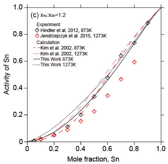 Figure 15 shows the calculated activity of Sn in liquid Au-Sb-Sn alloys along different sections ( = 2:1,  = 1:1,  = 1:2) at 873 K and 1273 K in relation to the experimental data [,]. A slight deviation from the experimental data [] at 1273 K was found. Nonetheless, good agreement was still achieved between the calculated activity of Sn in liquid Au-Sb-Sn alloys in this work and the experimental results [,].