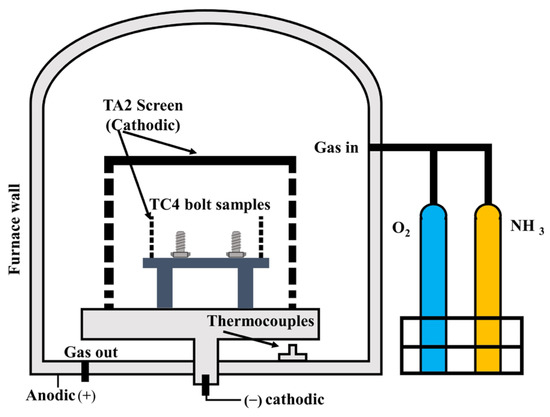 The material used for the experiments was TC4 alloy bolts, size M8 × 13 mm. The samples were acid washed with HF-HNO3 (45 mL HF (49%) + 205 mL HNO3 (65%) + 750 mL deionized water) solution to wash off the oil stains and oxide on the surface. The duration of the acid wash was ten minutes. Finally, the samples were cleaned separately using an ultrasonic treatment for 10 min with acetone and anhydrous ethanol. The samples were dried and loaded into the nitriding equipment.