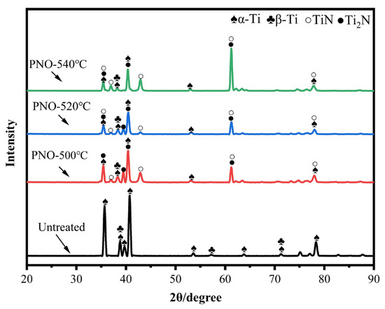 Figure 3 shows the XRD patterns of the UN and the PNO samples. The UN sample consisted of α-Ti with a close-packed hexagonal lattice (hcp) (100) orientation and β-Ti with a body-centered cubic structure (bcc) (101) orientation. For the PNO samples compared with the original sample, the α-Ti peak was weakened. The β-Ti was unchanged, while the diffraction peaks of TiN (PDF#38-1420) and Ti2N (PDF#76-0198) and some TiNx peaks appeared. In addition, both the α-Ti (100) and (101) diffraction peaks (PDF # 89-3725) shifted to a low angle, which indicates that the crystal lattice was distorted during the process of oxynitride [28,29]. The Ti2N phase was generated at a lower temperature of 500 °C, while the intensity of the TiN peak increased at higher temperatures of 520 and 540 °C. The main phases of the PNO samples were TiN and Ti2N.