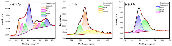 As shown in Figure 4, the Ti2p peak spectrum suggested that several components were present, including TiO2, TiN, TiON, and Ti2O3. By analyzing the binding energy, we can distinguish between the different components. Specifically, the presence of TiN can be identified by the binding energies of 454.98 and 460.61 eV, while TiON in TiNxOy can be represented by the binding energies of 455.99 and 461.60 eV [30,31]. The binding energy at 458.28 (standard value 458.3) and 464.16 eV (average value 464.19 eV) correspond to TiO2. This could be attributed to the distortion of the lattice structure in TiO2 caused by N-doping during plasma source oxynitride, which shifts the energy levels of the orbitals [32]. The binding energies of Ti2O3 were 456.96 and 462.87 eV [33]. The binding energy points of 395.8 and 396.98 eV in N1s corresponded to TiON and TiN, respectively. Three peaks were found in O1s, namely TiO2, Ti2O3, and TiON, with binding energies of 529.76, 529.8, and 531.34 eV, respectively [34].