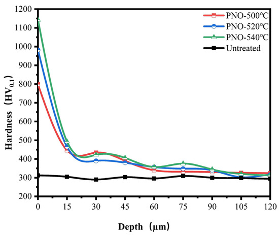 As shown in Figure 5, the surface hardness of the PNO samples was significantly improved compared with the matrix hardness of TC4 alloy (300.0 HV0.1). The surface hardness values of the PNO samples were 798.3 HV0.1, 982.1 HV0.1, and 1142.7 HV0.1, respectively. The results obtained from XRD indicated that TiN and Ti2N phases were on the surface of the PNO samples. The primary factor behind the increased surface hardness was the presence of the TiN and Ti2N phases [35,36]. As their content increases, so does the hardness of the surface. The microhardness change is associated with the treatment temperature. With the rise in the oxynitride temperature, the depth of the diffusion layer increased gradually. The diffusion layers of the PNO-500, PNO-520, and PNO-540 samples were 45 μm, 48 μm, and 75 μm, respectively. Nitrogen and titanium form an interstitial solid solution in the diffusion layer, improving the substrate’s surface hardness.