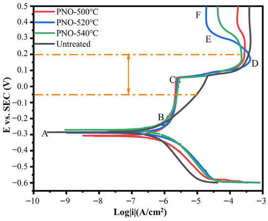 As shown in Figure 6, in the AB anodic region, the titanium alloy dental implant sample oxide began to dissolve, and the activation polarization affected the dissolution rate. The current density of the PNO sample changed very little at a potential of −0.2–0.1 V and hardly changed with the potential. In addition, the BC region was the active–passive transition region, where the formation of TiO2 passivation film could prevent the further dissolution of the base material [39]. The PNO samples had a common feature: the passivation film was generated at almost the same current density. By contrast, the UN sample generated passivation film at a much higher current density [40]. At 0.1–0.2 V, the passivation film dissolved, at which time the current density and potential increased. At point D, there was a sharp decrease in current density and a corresponding increase in potential, leading to the regeneration of the passivation film [41]. The potential for further growth in EF regional voltage is still significant, while the current remains relatively unchanged. The surface of the sample generated a dense passivation film, indicating that it was in a stable passivation stage. The anodic polarization suggested that the passivation film on the PNO samples underwent a repassivation process involving forming, dissolving, and regenerating the indicated morphology of the anode region, suggesting the presence of a protective layer. By contrast, the cathode region produced predominantly hydrogen. Electrochemical polarization characteristic tests showed that the corrosion resistance of the PNO samples was better than that of the UN sample in the human oxidation potential (−58–212 mV) range.
