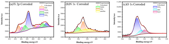 To elucidate the factors affecting the corrosion resistance of PNO samples in artificial saliva and their passivation film repassivation mechanism, XPS analysis was conducted on PNO-520 corrosion specimens (Figure 7). A Ti2O3 peak observed at the 456.2 and 461.81 eV binding energies in the Ti2p spectrum suggested that oxidation reactions occurred on the surface of the titanium alloy. The fitted peaks of Ti2p were all paired. The observed binding energies of Ti2p3/2 = 455.12, 457.2, and 458.46 eV, and Ti2p1/2 = 460.76, 463.31, and 464.48 eV indicated the presence of TiN, TiON, and TiO2. N1s correspond to TiON and TiN with binding energies of 395.99 and 397.06 eV (standard binding energy: 397.00 eV) with an overall decrease in the area of the peaks. The O1s orbital exhibited three closely fitted peaks. The binding energy of 529.92 eV is a prominent characteristic of TiO2. The binding energy of 531.09 eV meant that the hydration reaction of TiO2 in artificial saliva generated OH−. The binding energy at 531.96 eV represented H2O as the bound water absorbed by the sample oxide film [52]. The O1s peak showed that the passivation film mainly comprised TiO2, a small amount of Ti(OH)x, and an oxide film combined with water. The presence of these oxides improves the microstructure’s uniformity and improves the sample’s corrosion resistance [53].