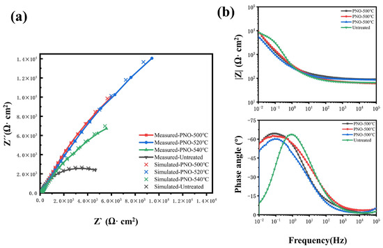 Figure 8 shows the Nyquist and Bode plots of TC4 alloy in human artificial saliva. The Nyquist curve represents the variation of impedance among different titanium alloy samples. The capacitance vs. frequency curve exhibited a flat, incomplete resistance arc across the entire frequency range. Moreover, the shape of the arc suggested the involvement of electrochemical charge transfer [49]. With an increase in temperature, the transfer of charges at the surface of the electrode exhibits greater intricacy, causing an increase in resistance and an enhancement in corrosion resistance [11,54]. As a consequence, a greater scope of the capacitive arch arises. This tendency holds ultimately. The convex peak on the Bode phase angle diagram and the linear change in the Bode impedance diagram in the low-frequency region range (10−2–101 Hz) with a slope close to −1 reflect the capacitive behavior at the interface between the passivated film and the artificial saliva with the typical characteristics of an ideally polarized electrode [49,55]. In comparison with the PNO samples, the UN sample showed considerably lower values for the capacitive arc radius, as well as for the Bode phase angle and impedance at low and medium frequencies. This suggests that the UN sample exhibits more pronounced ion transport and electrode reaction processes [6,56]. The correlation between measured data and simulated data is shown in Figure 8a. The measured data matched well with the simulated data. The corrosion resistance of the UN sample was worse than that of the PNO samples. This showed that the corrosion resistance of the specimens was in the order of PNO-520 > PNO-500 > PNO-540 > UN.