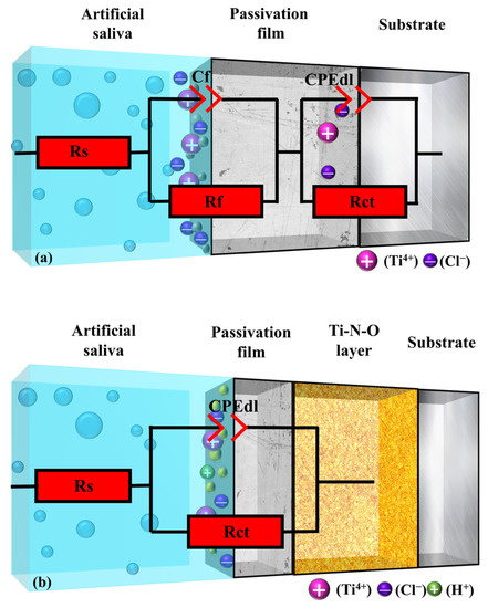 The size of the circuit parameters was simulated using Zview-2 software. The correlation between the measured data and the calculated data is shown in Figure 8a. The measured data matched well with the simulated data. The UN sample was a non-dense porous electrode circuit with a double-time constant that denoted the solution resistance. Rf represents the charge transfer reaction resistance. Cf denotes the bilayer capacitance. Rct and CPEdl represent the resistance and capacitance of the passivated film [57]. As can be seen in Table 4, the passivation film Rct (6.50 × 103 Ω·cm2) of the UN sample was more significant than the charge transfer resistance Rf (86.98 Ω·cm2). This indicates that the passivation film’s generation hindered the charge transfer from the artificial saliva to the titanium alloy substrate. At this time, corrosion mainly occurred in the interface between the artificial saliva and the multilayer pores of the passivation film (Figure 9a). The above behavior (Figure 9a) is called crevice corrosion, in which the artificial saliva can penetrate the TC4 alloy substrate through defects, crevices, and pores [58].