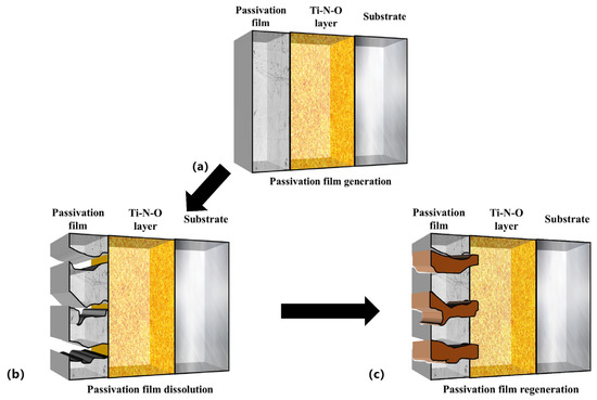 Secondly, the chemical stability of Ti-N-O, the intermediate product of the titanium-nitrogen compound and titanium-oxygen compound, is not as good as titanium oxide. Since the Ti-N bond dissociation energies are lower than those of the Ti-O bond, the intermediate product TiNxOy partially dissolves. Additionally, according to reaction (6), the passivation film undergoes a hydration reaction, leading to the further dissolution of the film (see Figure 10b).