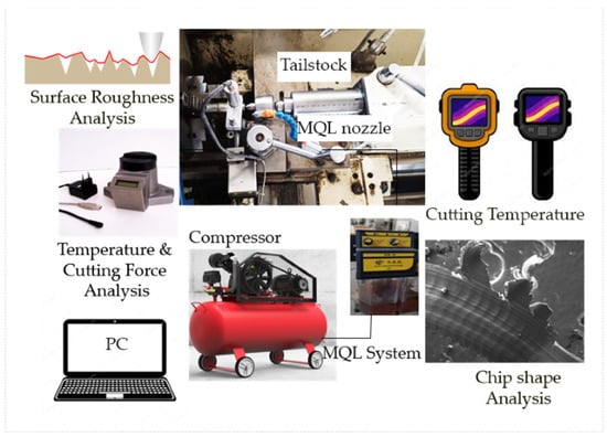 The turning trials of AISI 304 were performed by lathe machine (De Lorenzo S547-8899, Rozzano, Italy). Turning tests were conducted as required by ISO 3685 standards. Experiments were conducted under MQL-assisted and dry-cutting environmental conditions. Machining cases were optimized by the full factorial design method. The effects of four different defining parameters in Table 2 and two environment conditions, dry and MQL were analyzed. Kar-tes STN15 MQL device with timed pots was installed at 20 mm distance and mineral oil-based (olive oil) was sprayed from a nozzle in diameter of 2 mm. MQL is a machining technique that aims to reduce the amount of coolant and lubricant used during the machining process. This technique helps to minimize the environmental impact of machining by reducing the amount of waste generated, as well as reducing the amount of energy needed for cutting. The compressor was set at 6 bars on MQL with a 45° nozzle angle and 50 mL/h flow rate. Cutting inserts and chips were subjected to metallographic analysis after each cutting test. Scanning electron microscobe (SEM) imaging method was utilized to investigate microstructure of the chip. The graphical abstract of the study is given in Figure 1.