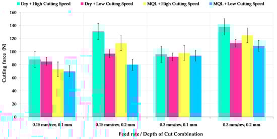 - Cutting speed is a significant parameter of cutting force in both dry and MQL environment conditions. There was a sharp increase in cutting force depending on the increase in feed rate while the effect of cutting speed was lower at low feed rate.