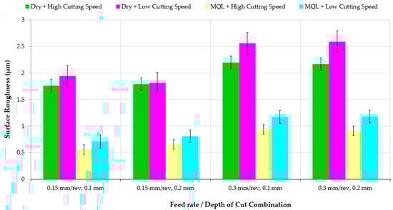 Surface roughness is indeed a critical parameter in high-strength stainless steel machining. Surface roughness can regulate the behavior, aesthetics, and functionality of the machined part. The surface roughness can be controlled by various factors, including the machining inputs, cutting speed, feed rate, tool material, and lubricant, and its application type. Dry and MQL-assisted machining cases are evaluated in this section by means of Ra values. The increase of surface roughness is approximately 2.5 times for all machining input values. However, less change is obtained by varying cutting speed in both environment conditions. On the other hand, the feed rate displays a major influence (more than 30%) on surface roughness. No significant change in surface roughness is observed in turning different lubricating conditions with increasing cutting depth. The variation of the indicators for all cutting parameters gave a similar profile. The roughness results vary in the large range of (0.6–2.6 μm). Poor surface finishes were observed in machining AISI 304 under dry conditions for all cutting parameters. On the other hand, minimum surface roughness values were measured in MQL machining conditions. Surface roughness values were slightly increased in higher cutting combinations under a dry environment. The increasing temperature on the machining surface and the corresponding change at the material pair interface primarily affect the surface aspects. Elevating temperature, depending on the increasing feed rate, confirms the increase in Ra values and resultant an increment in cutting force. Two main inputs i.e., V and f, simultaneously affect the surface roughness when cutting ductile AISI 304 specimens. As seen in Figure 3, lower surface roughness values were achieved at elevated cutting speed and reduced feed rate parameters. A high feed rate causes more heat generation during machining so higher Ra values respond strongly to the feed rate. An approximately 25% decrement in surface roughness value is achieved by reducing the feed rate.